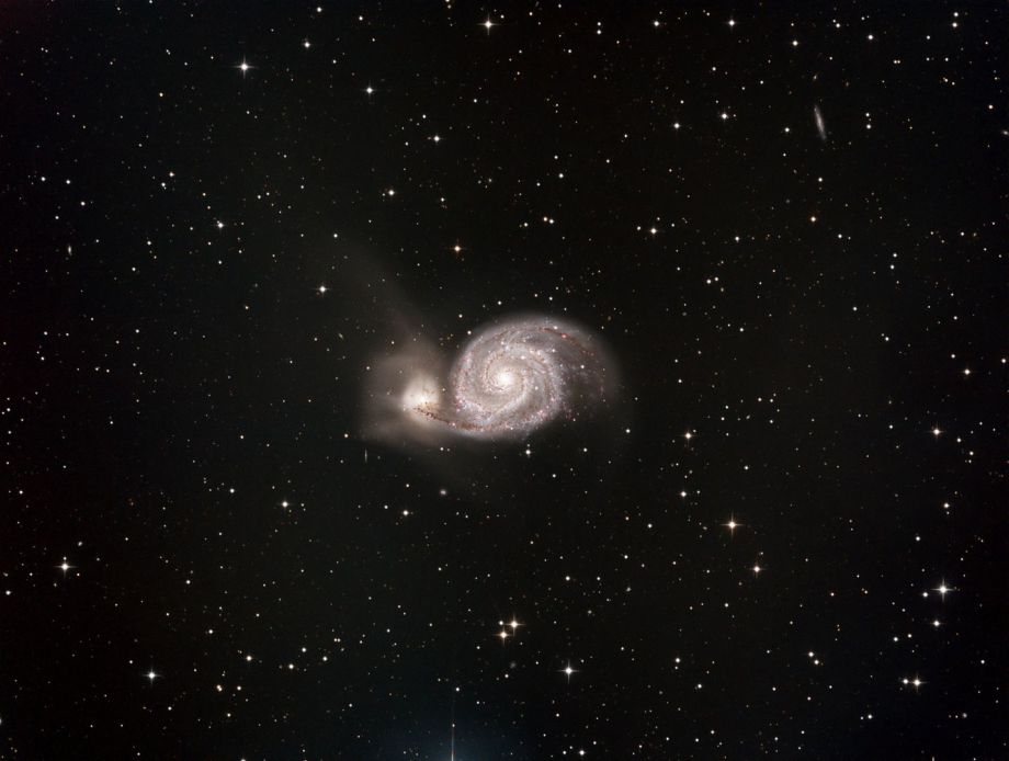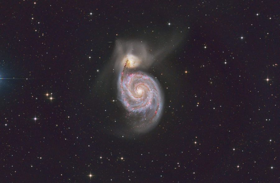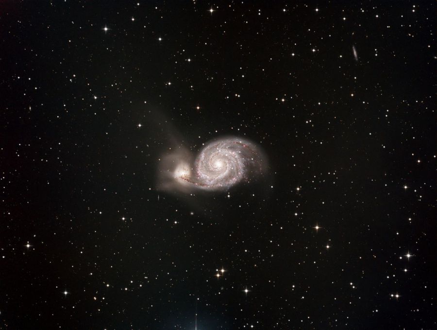M51 - Strudelgalaxie in NRGB, ein Paar wechselwirkender Galaxien(Wiki). Durch das sog. Kontinuumssubtraktionsverfahren werden HAlpha Emissionsgebiet (in Rot) hervorgehoben. Wunderbar erkennbar der Materiestrom zwuschen den beiden Galaxien, in denen sich Sternentstehungsgebiete gebildet haben.