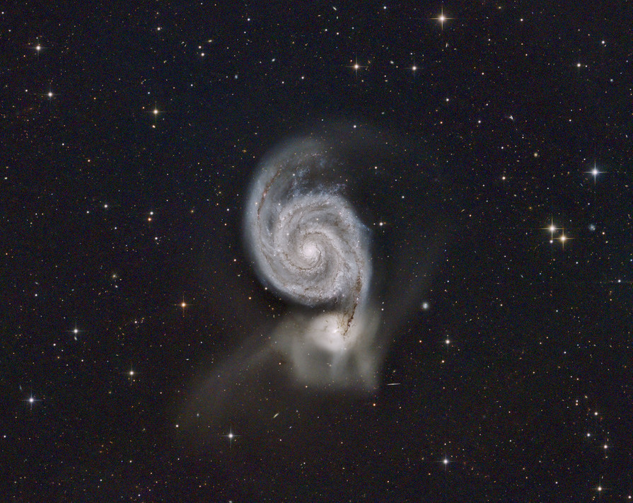 Nach 2 Jahren habe ich M51 erneut mit einem anderen Setup fotografiert. Deutlich sichtbar jetzt der Halo (Gezeitenschweif, Sternströme) um die beiden wechselwirkenden Galaxien.