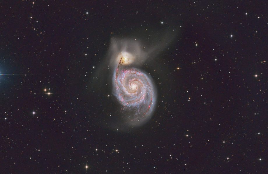 Hier sehen wir einen eher regulären Halo rund um die Hauptgalaxie (M51), git erkennbar links und rechts. Im Bereich der oberen, kleineren Galaxie (NGC5195) ist der Halo wesentlich stärker ausgeprägt und in der Form völlig anders. Die Sterndichte ist hier nach der Kollision deutlich höher.