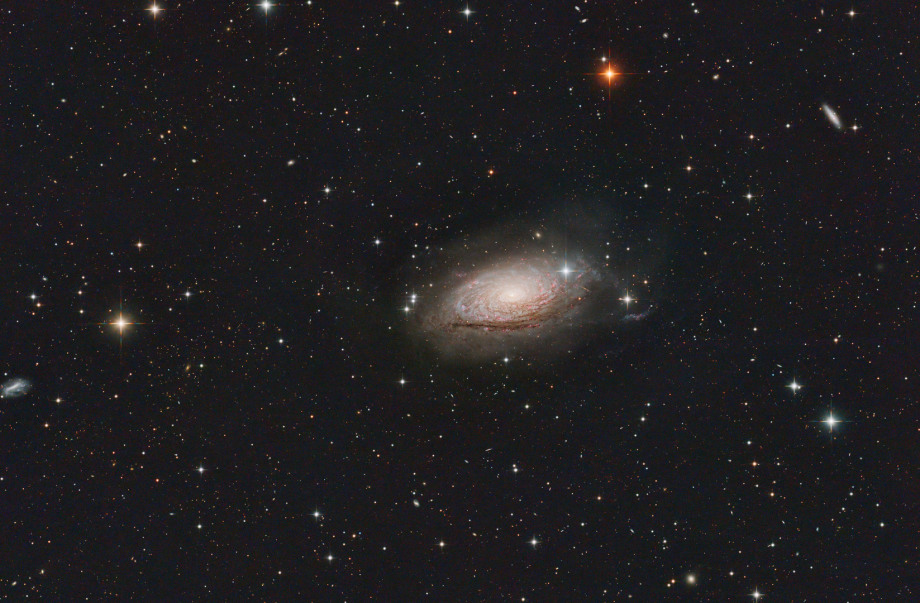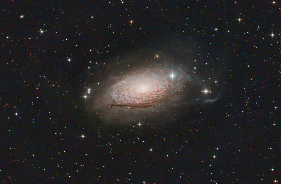 Das Bild ist ein NRGB Komposit, d.h. Farbbilder wurden mit Schmalbandaufnahmen in HAlpho und OIII kombiniert. Durch diese Kombination werden die Sternentstehungsgebiete in den Spiralarmen deutlich sichtbar.