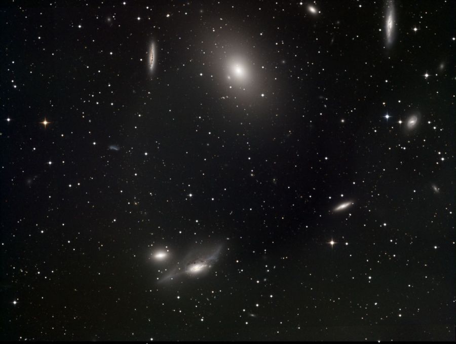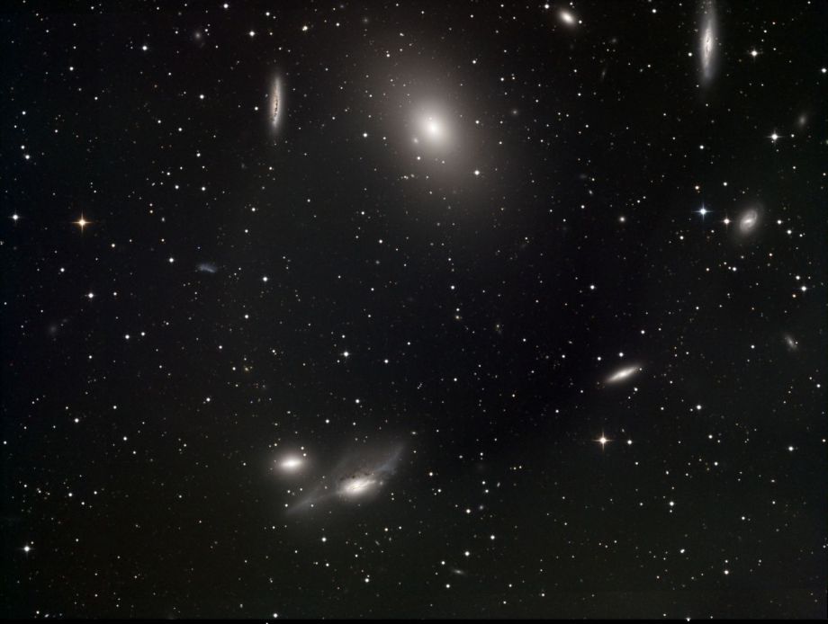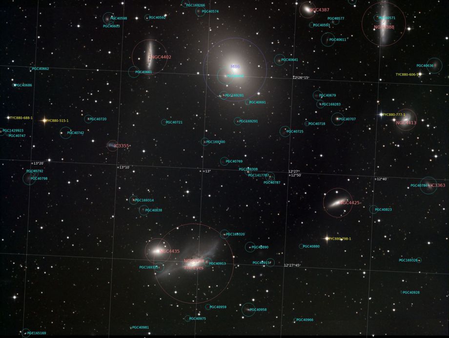 "The Eyes" (Wiki), im unteren Bildbereich. Die Aufnahme zeigt einen Ausschnitt der "Virgo Haufens", ein Himmelsbereich im Sternbild Jungfrau. The Eyes ist ca. 52Mio LF von uns entfernt. Der ausgedehnte Helle Fleck in der oberen Bildmitte ist M86. Man vermutet heute, dass "The Eyes" mit M86 kollidierte und deshalb die irreguläre Form aufweist. Tiefenbelichtung in RGB.