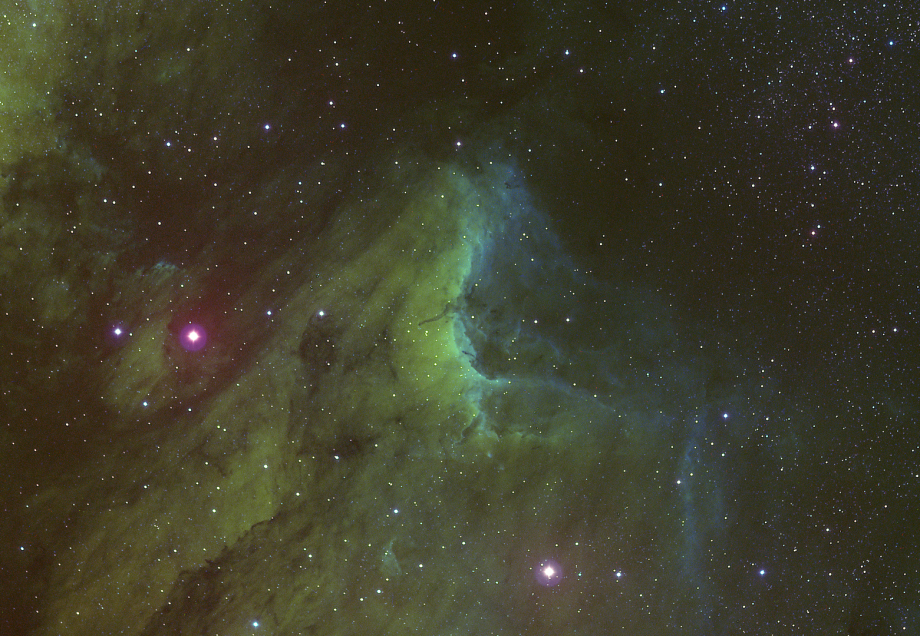 Aufnahme mit Schmalband Interferenzfiltern HAlpha und OIII, in drei Nächten mit 600s/900s/1800s pro Bild insgesamt etwa 6h belichtet.