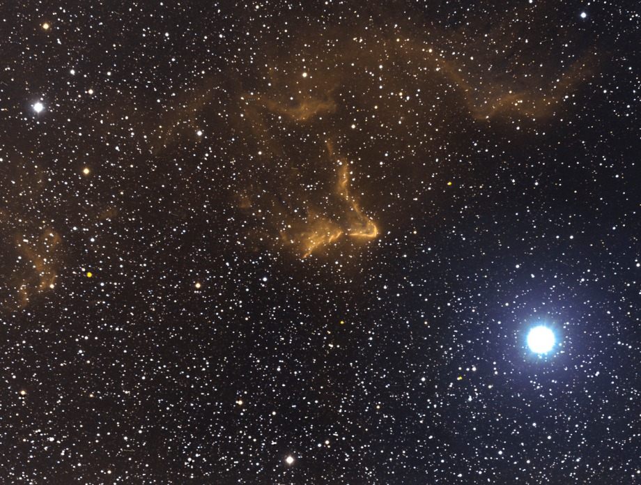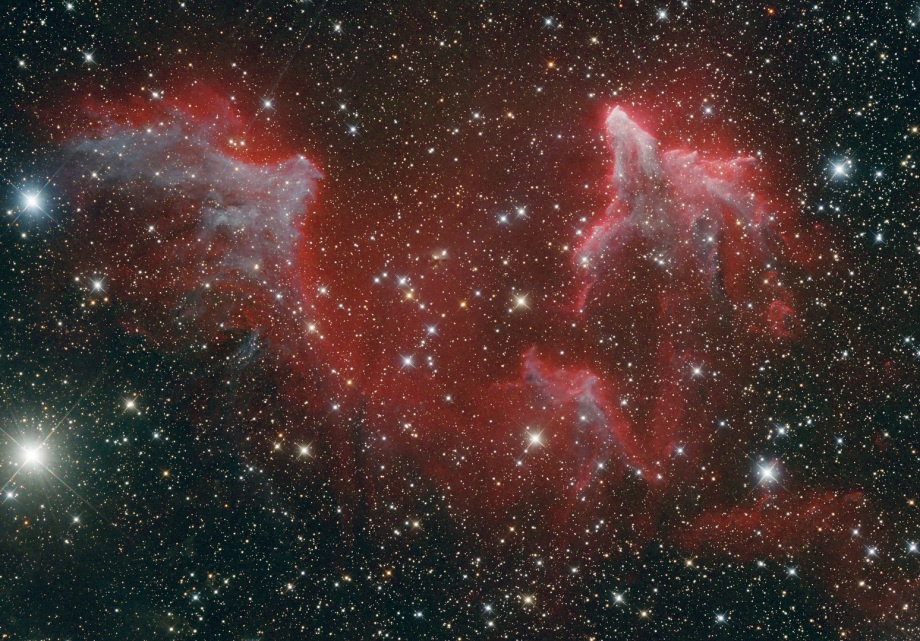 IC63 (rechts) und IC59 (links) liegen mit 3...4 LJ Entfernung sehr dich am Stern Gamma Cas, dessen im Vergleich zu den Nebeln sehr intensives Signal am oberen Bildrand noch sichtbar ist.