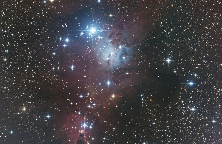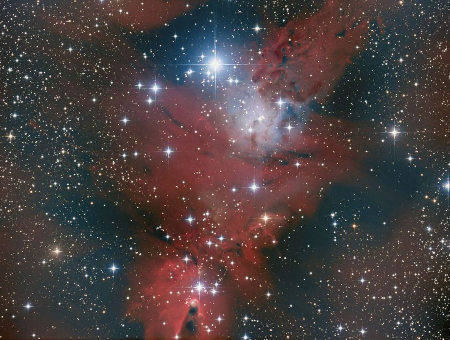 Auf dem Bild sieht man vier unterschiedliche Objekte: einen offenen Sternhaufen, einen Reflexionsnbel (bläulich mit Dunkelwolken), eine ausgedehnte rot leuchtende Wasserstoff (HII) Region und unten im Bild einen Teil des "Konus Nebels". Cluster, HII-Region und Reflexionsnebel werden unter dem etwa 2500LJ entfernten "NGC2264" zusammengefasst. Das Bild zeigt einen Himmelsauschnitt von ca. 1° x 45', grob Vollmondgröße.