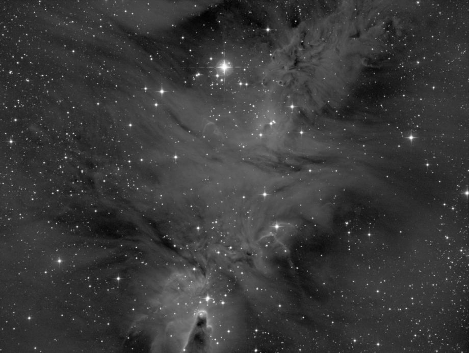 NGC2264 im Wasserstofflicht: Monochrome Aufnahme durch ein 7n HAlpha Schmalbandfilter.Dieser Filter läßt die zentrale Emissionsline des neutralen Wassersoffs (656,3 nm +/- 3,5nm) durch. Alle anderen Farben/Frequenzen werden stark unterdrückt. Damit sinkt auch das Rauschsignal und der durch Lichtverschmnutzung aufgehellte Himmelshintergrund.