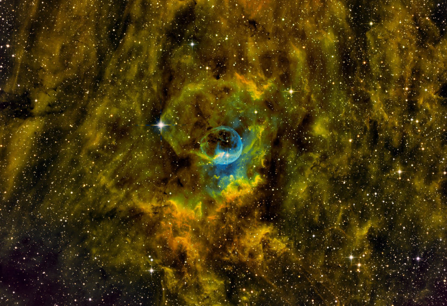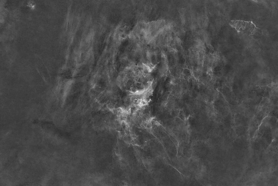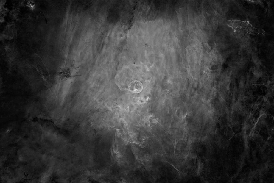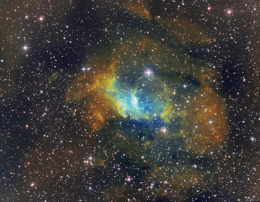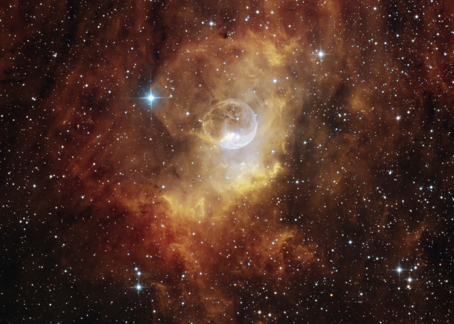 Bei dieser mit einer Mono Kamera und Schmalbandfiltern erstellten Aufnahme sind die Strukturen der HII/SII Regionen unterhalb der Blase durch den SII Filter sehr viel feiner herausgekommen als in den älteren Aufnahmen, in denen lediglich HAlpha und OIII Filter verwendet wurden.
