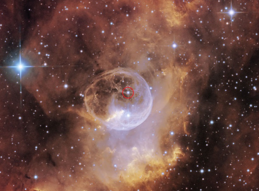 Der Stern stößt große Mengen an Gas mit 28 Km/sec aus, welches mit den den Stern umgebenden umgebenden Molekül- und Wasserstoffwolken kollidiert und dann die als Blase sichtbare Schockfront ausbildet.
