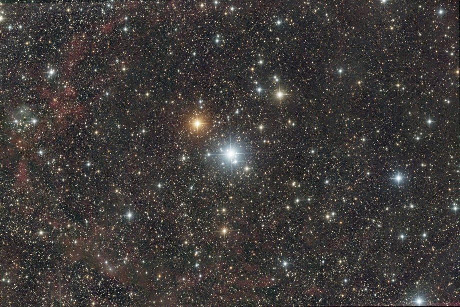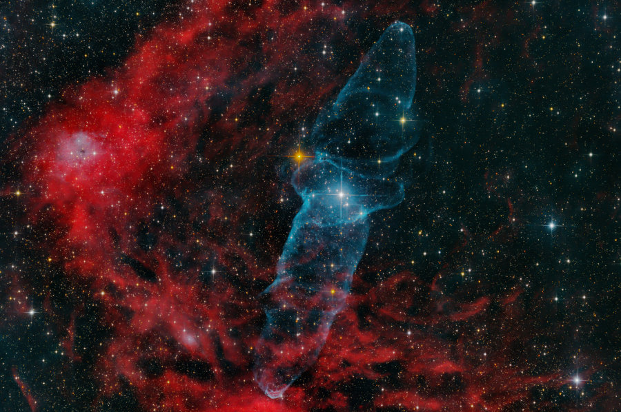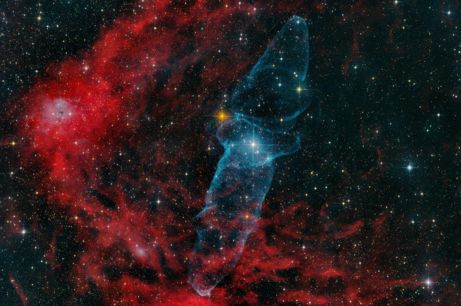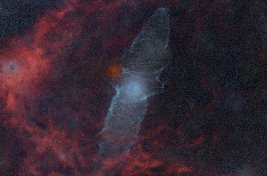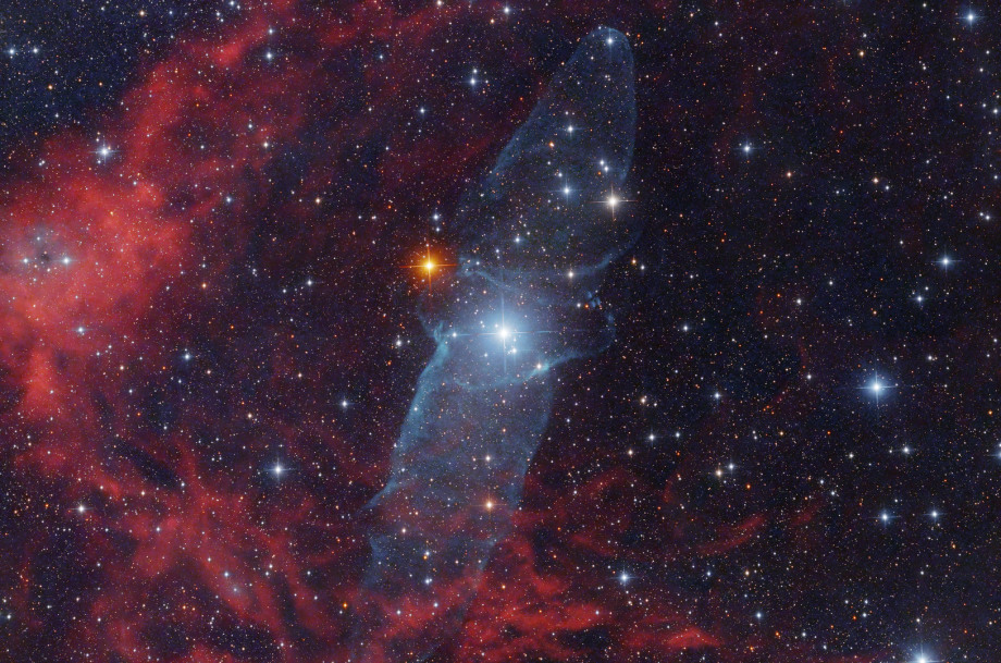 Der Tintenfischnebel (in SH2-129 oder OU4) wurde erst 2011 von einem französischen Amateurastronom entdeckt, davor war über dieses wunderschöne Objekt nicht bekannt. Inzwischen weiß man, dass der blaue bipolare Nebel Teil der umgebenden Wasserstoffregion SH2-129 (im Bild links, der Rest ist in diesem Ausschnitt nicht sichtbar) ist, etwa 2300 LJ von uns entfernt ist und eine gewaltige Ausdehnung von 50 LJ hat. Erzeugt wirde der blau leuchtende Nebel vermutlich von mehreren hellen Zentralsternen.