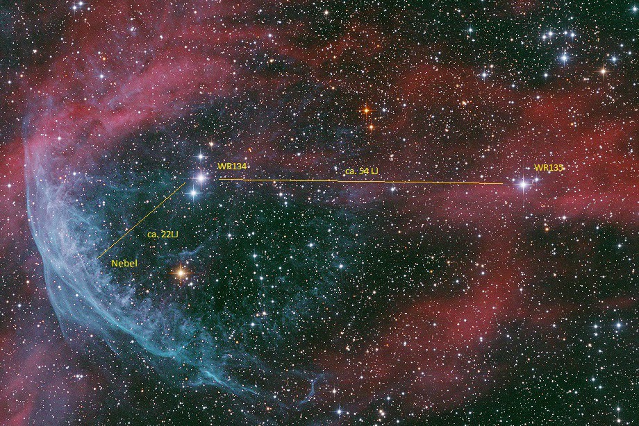 Ich habe die Abstände zwischen den beiden dicht beiainander liegenden WR Sternen und den Abstand von WR134 zur "Nebelfront" abgeschätzt. Unter der Annahme, dass beide Sterne und der Nebel etwa gleich weit - 6000 LJ - von uns entfernt sind, ergeben sich Abstand WR134/135 zu ca. 54LJ, von WR134 bis zum kondensierten Nebel 22 LJ.