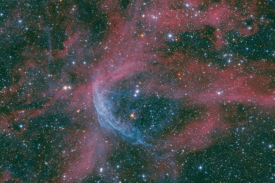 Auf dieser Aufnahme sind gleich zwei WR Sterne zu sehen, WR134 und WR135, beide etwa 6000LJ von uns entfernt. Der blaue filigrane Nebel wird vermutlich von WR134 erzeugt, die (roten) Wasserstoffwolken stammen vermutlich von beiden Sternen und dehnen sich weit über den Bildausschnitt aus.