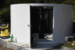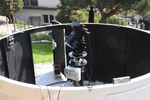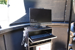 Ein Großteil der Elektronik ist in einem Schaltschrank untergebracht, von dem aus die Kabelstränge durch ein DN40 Rohr im Betonboden zur Säule führen und dort im PierController enden. Am Piercontroller werden dann die für die jeweilige Konfiguration notwendigen Kabel für Teleskop und Kameras eingesteckt. Schaltschrank und Rechner (ein all-in-one) sind in einem fahrbaren Schränkchen untergebracht. Als Bodenbelag habe ich zunächst PVC Platten/Kacheln auf den Beton geklebt - mehr dazu unter "Probleme und Erkenntnisse".
